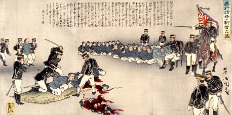 جنودٌ يابانيون يقطعون رؤوس أسرى منشوريين، وزملاؤهم يشاهدون هذا الاحتفال الدموي (1894)