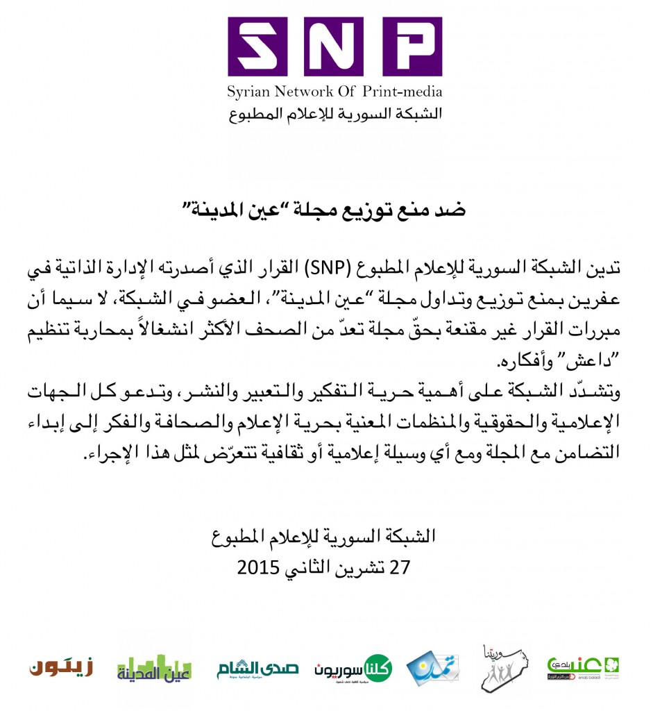 اقرأ المزيدضد منع توزيع مجلة “عين المدينة” تدين الشبكة السورية للإعلام المطبوع (SNP) القرار الذي أصدرته الإدارة الذاتية في عفرين بمنع توزيع وتداول مجلة “عين المدينة”، العضو في الشبكة، لا سيما أن مبررات القرار غير مقنعة بحقّ مجلة تعدّ من الصحف الأكثر انشغالاً بمحاربة ت...